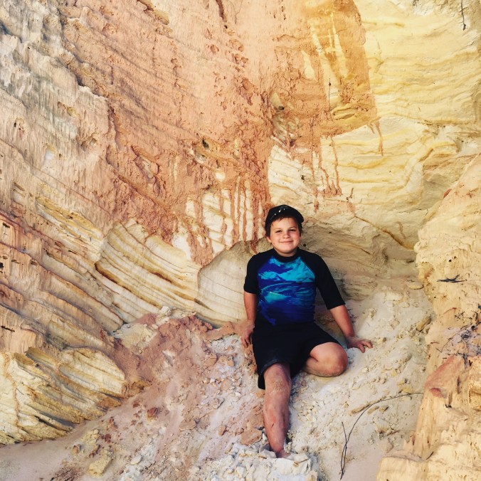 Elim Beach is spectacularly beautiful. I know, I know….. I need to find some new adjectives to use instead of spectacular. I promise I’ll think harder tomorrow. As we were driving into Elim Beach Jazzy commented that the surrounding hills looked like they had snow on them. This was due to the white sand. As we drove up the beach, the sand dunes were a rainbow of colours, from black at the base to warm yellows, oranges and dusty reds. There was spring water spewing out from the sand everywhere, leading to an extremely unique display of flora on the beach. Trees and bushes that are not usually seen in beachy, saltwater areas, were sprouting up in the sand dunes due to the abundance of spring water. The kids found a spot on the beach where water was coming out of the rocks like a mini fountain. We all had a drink from it. Ben declared it to be the best water he has ever tasted. Me, being quite the water connoisseur (I could probably do a whole blog about my skills as a water taster) found it to taste quite minerally. It was not to my liking, but I definitely appreciated the fact that it was there.
